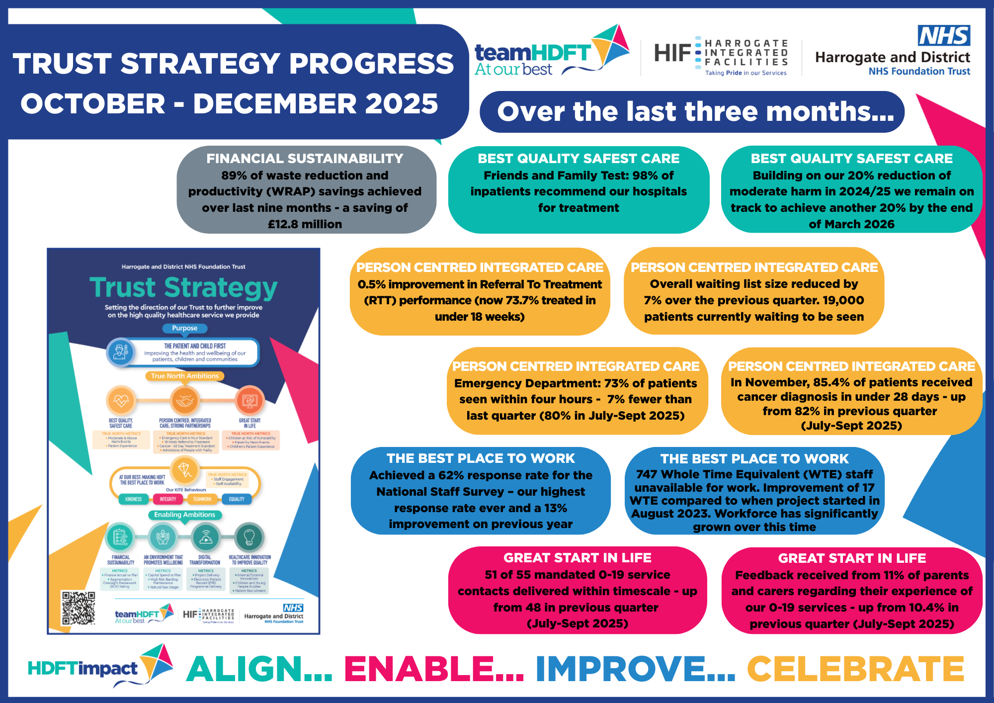 HDFT has been using “lean” improvement methods for over 10 years and we’ve seen the improvements it can bring for patients and colleagues. HDFT Impact builds on this experience to put continuous improvement at the centre of our culture and ways of working. It will align improvement with our Strategy and enable improvement through coaching and support. Through proven systems, routines and tools, teams will make significant, long lasting improvements as part of their daily work. HDFT Impact will mobilise all 5,000 colleagues in TeamHDFT to improve quality in everything we do. We will celebrate and encourage improvement by everyone and everywhere throughout the Trust.